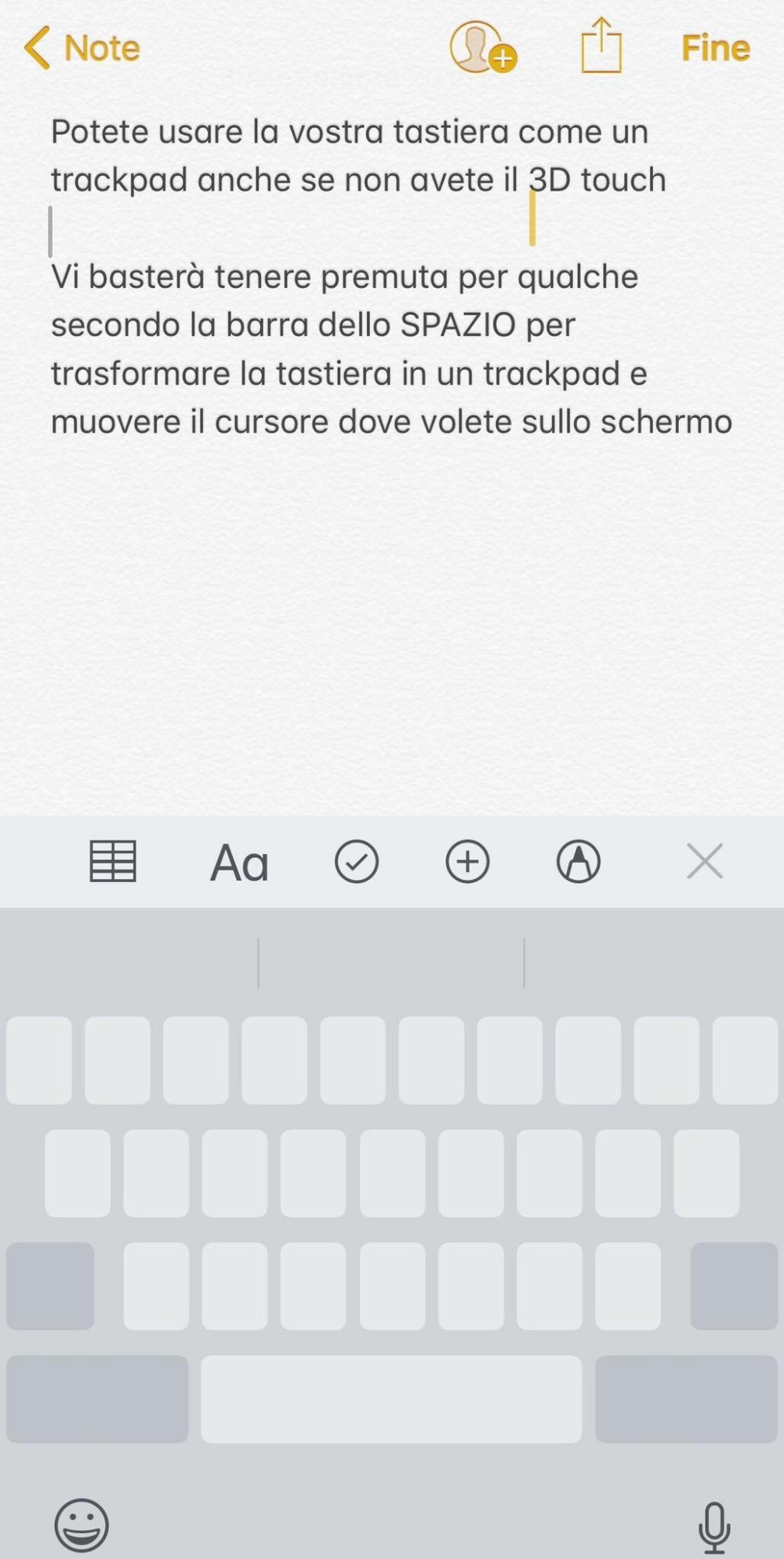 Con iOS12 potete usare la vostra tastiera come un trackpad anche se non avete il 3D touch sul vostro dispositivo 😬 : vi basterà tenere premuta per qualche secondo la barra dello SPAZIO per trasformare la tastiera in un trackpad, e muovere il cursore dove volete sullo schermo 😍