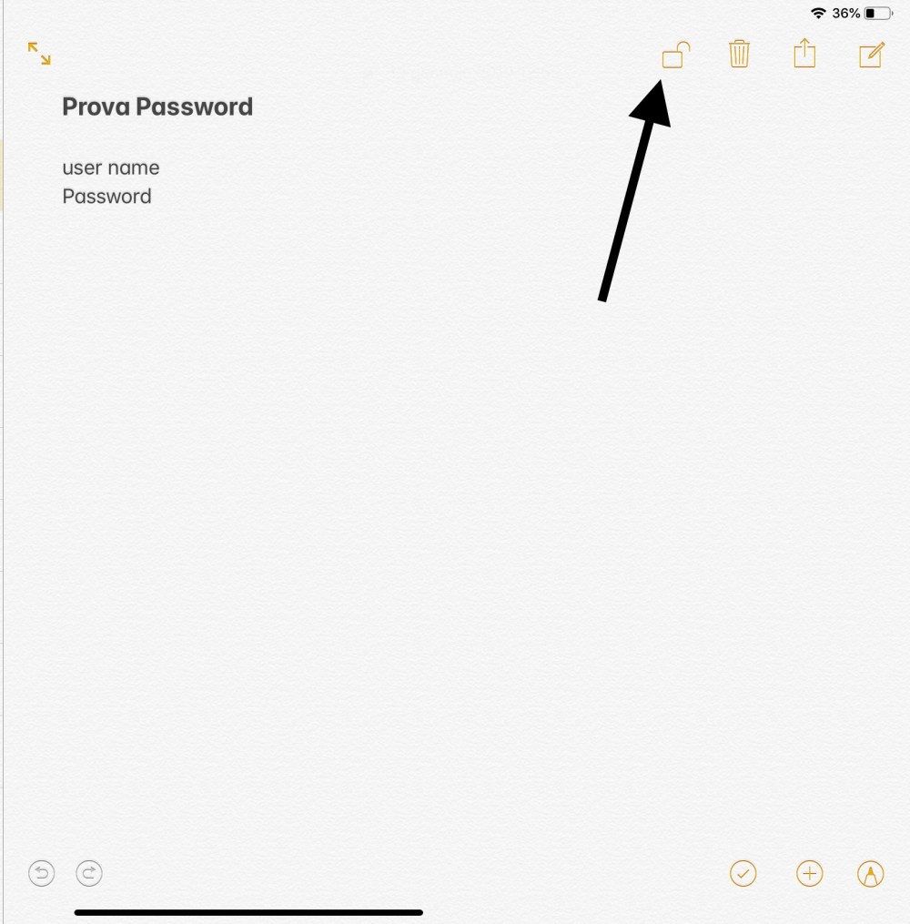 In alto a destra ora noteremo un’icona a forma di lucchetto aperto, cliccando sull’icona iOS bloccherà la visualizzazione della nota.