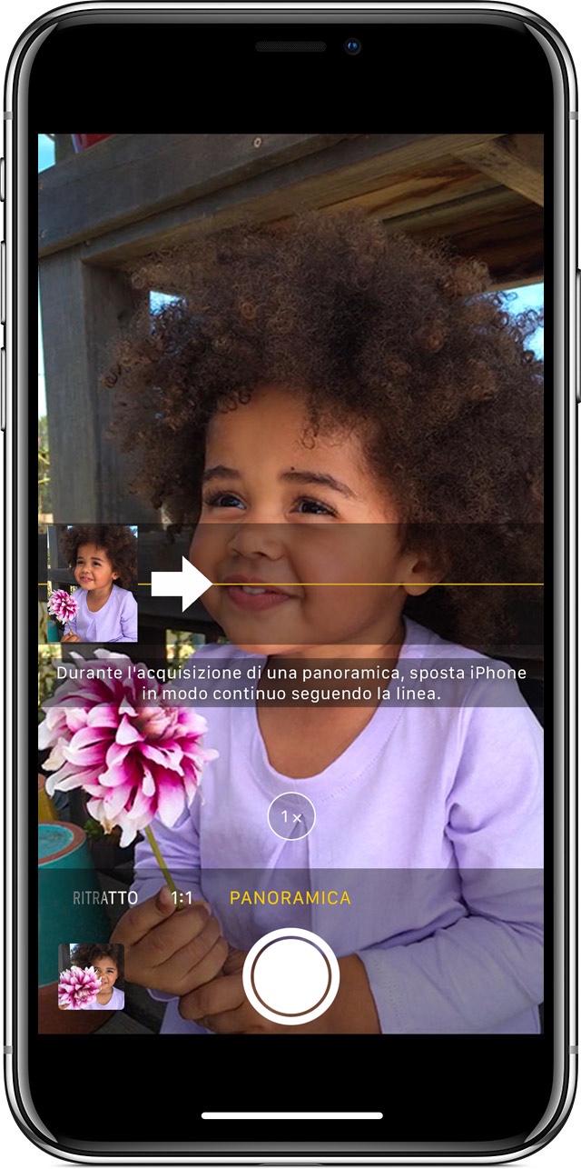 Su iPhone 7 Plus, iPhone 8 Plus o iPhone X e versioni successive, toccando 1x possiamo avere uno zoom di alta qualità anche da lunghe distanze. Se vogliamo usare uno zoom maggiore di 2x o per controllare con precisione l’immagine, teniamo premuto 1x o 2x per visualizzare un cursore che consente di ingrandire l’immagine fino a 10x.