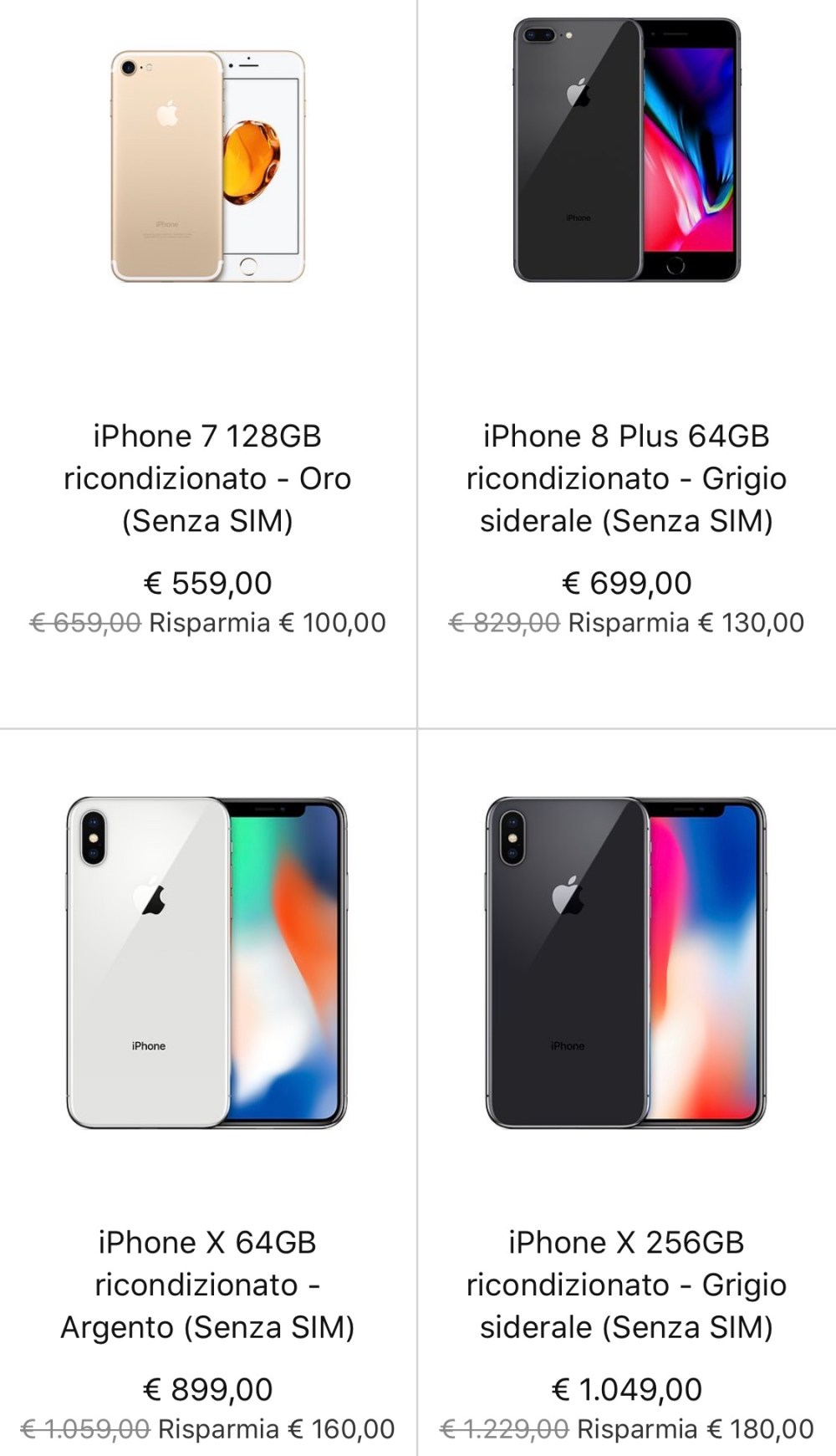 A questo link potete trovare tutti gli iPhone disponibili sul sito Apple: peccato che il risparmio sia davvero minimo, e varia a seconda del modello, tra i 100 e i 180€.