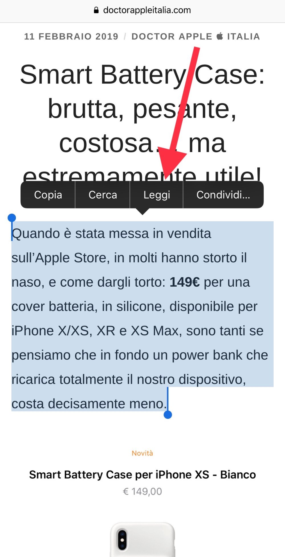 Ora se andiamo su un testo, qualunque esso sia, e lo selezioniamo, apparirà tra le altre opzioni LEGGI.