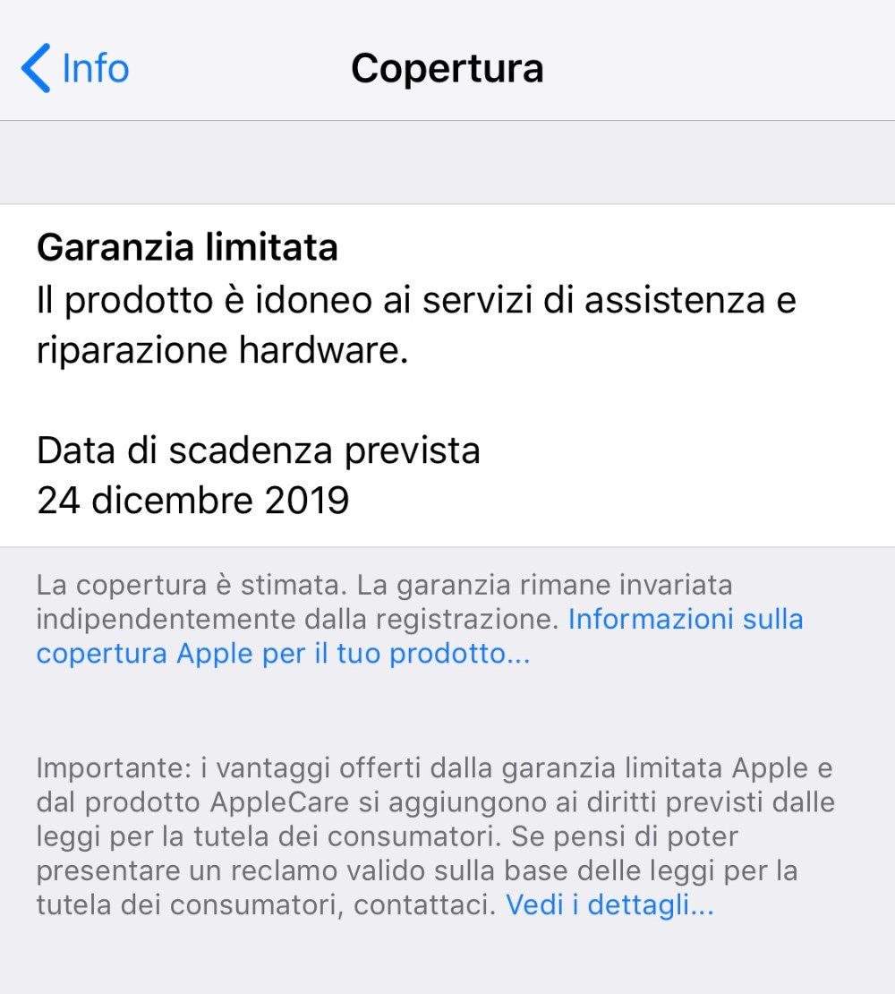 Se il vostro dispositivo è ancora all’interno dell’anno di garanzia Apple, vi comparirà la scritta Garanzia Limitata, e cliccandoci sopra potremo accedere a questa schermata:
