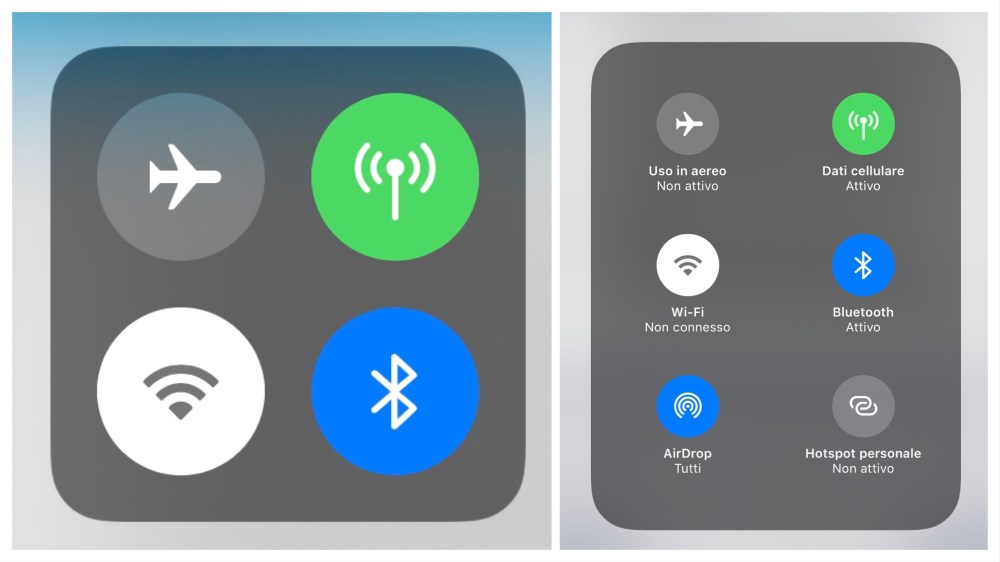 - Attivazione Rapida Hotspot Personale: Se il vostro dispositivo è dotato di 3D touch, vi basterà andare nel Centro di Controllo, premere con forza in un punto qualsiasi del riquadro che contiene le 4 icone della connettività (modalità aereo, 4G, WiFi e Bluetooth) per vedere che il riquadro si espanderà fino mostrare anche i pulsanti di attivazione dell’HotSpot Personale e di AirDrop.