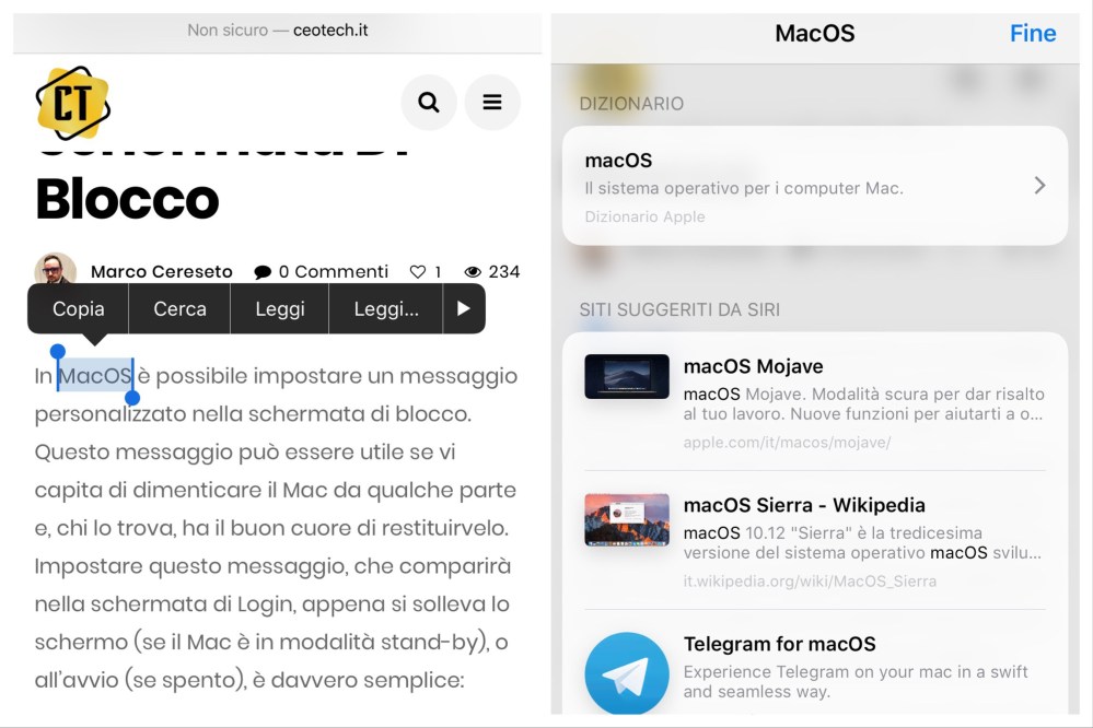 Avete trovato qualcosa di interessante e ora avete bisogno di affinare la ricerca? Selezionate la parola o le parole che compaiono nella pagina selezionata (basta tenere premuto un po’ a lungo con il dito sulla prima parola di nostro interesse ed evidenziare il testo di nostro interesse) e scegliere “Cerca” nelle opzioni che compaiono per cercare sul web o nei dizionari integrati nel sistema.
