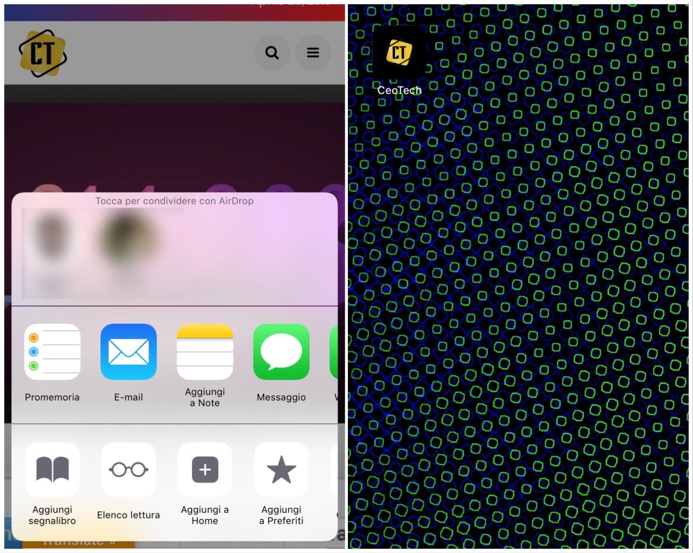 Se volete impostare una pagina web affinché sia visibile nell’home screen di iOS, vi basterà aprire il sito web di vostro interesse, selezionare l’icona di condivisione in basso al centro, scegliere “Aggiungi a Home” e “Aggiungi”: verrà aggiunta un’icona sulla Home da cui sarà possibile accedere rapidamente al sito web in questione.