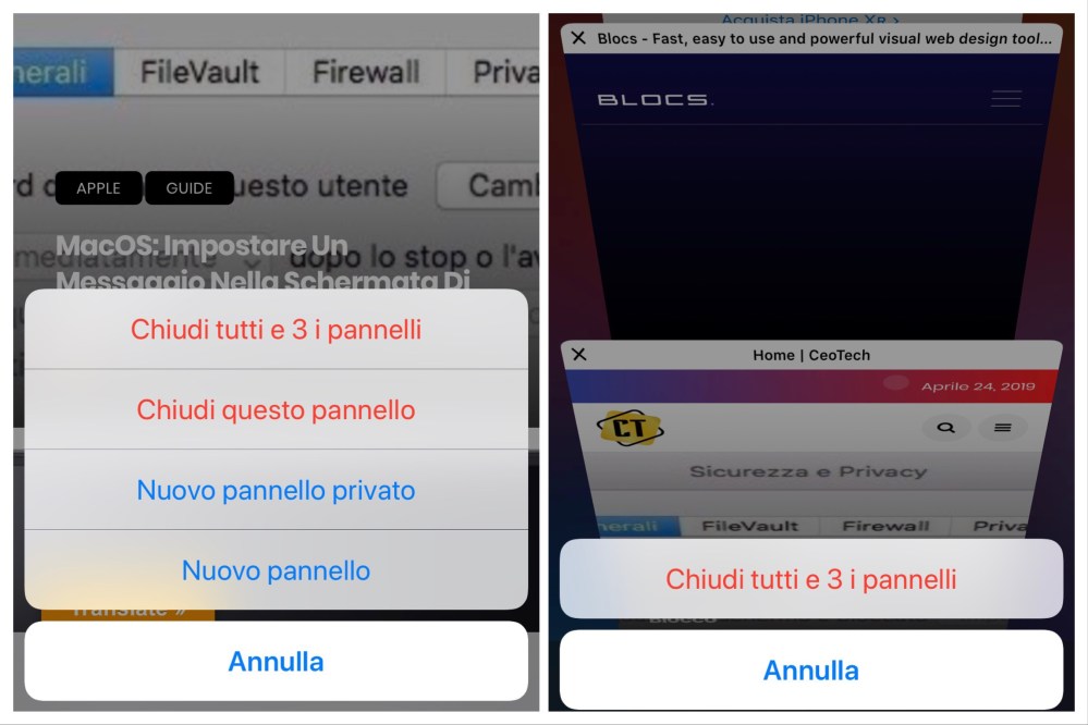 Avete aperto vari pannelli e li volete chiudere. Non c’è bisogno di farlo uno per volta: basta tenere premuto a lungo l’icona in basso a destra con i 2 quadratini, per visualizzare alcune opzioni e, tra queste scegliere “chiudi tutti i pannelli”. Se invece siete nella schermata che vi mostra le varie finestre aperte, tenete premuto su “Fine”