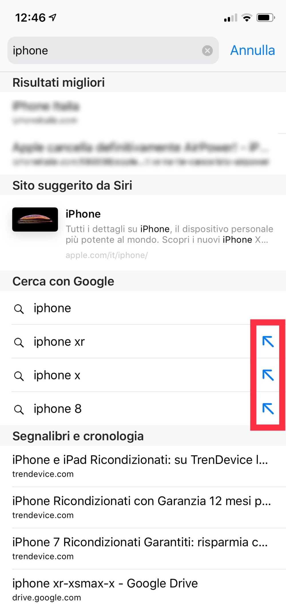 Come per il punto precedente, se state cercando una parola, nella barra delle ricerche noterete che apparirà il campo con indicato Cerca Con e un elenco di parole con altre aggiunte dal sistema. Sulla destra noteremo una freccia blu rivolta verso l’angolo in alto a sinistra, se clicchiamo su quella freccia, in corrispondenza della parola desiderata, riempiremo il campo di ricerca con quella parola.