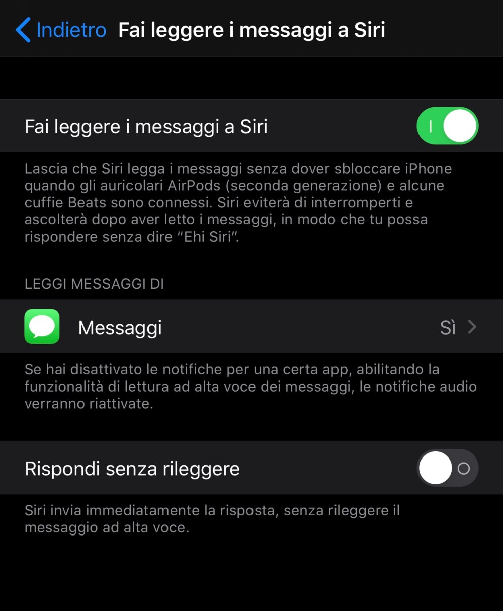 Per attivare questa funzione andiamo su IMPOSTAZIONI > SIRI E RICERCA > LEGGI MESSAGGI e attiviamo Fai Leggere I Messaggi a Siri.