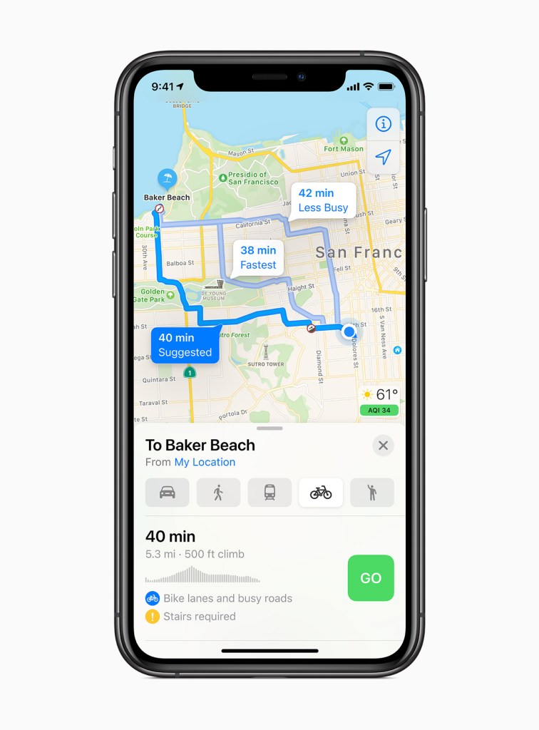 In iOS 14 sarà più semplice utilizzare l’applicazione Mappe grazie ad alcune funzionalità aggiuntive. Ci saranno le guide che raccomanderanno i posti migliori di una determinata città. È stata aggiunta la possibilità di ottenere indicazioni specifiche se il proprio mezzo è la bicicletta, per evitare quindi scale e percorsi difficili. EV routing invece permetterà di trovare le stazioni di ricarica per le auto elettriche; troverà la stazione adatta alla propria auto e per ora funzionerà con le auto BMW e Ford.