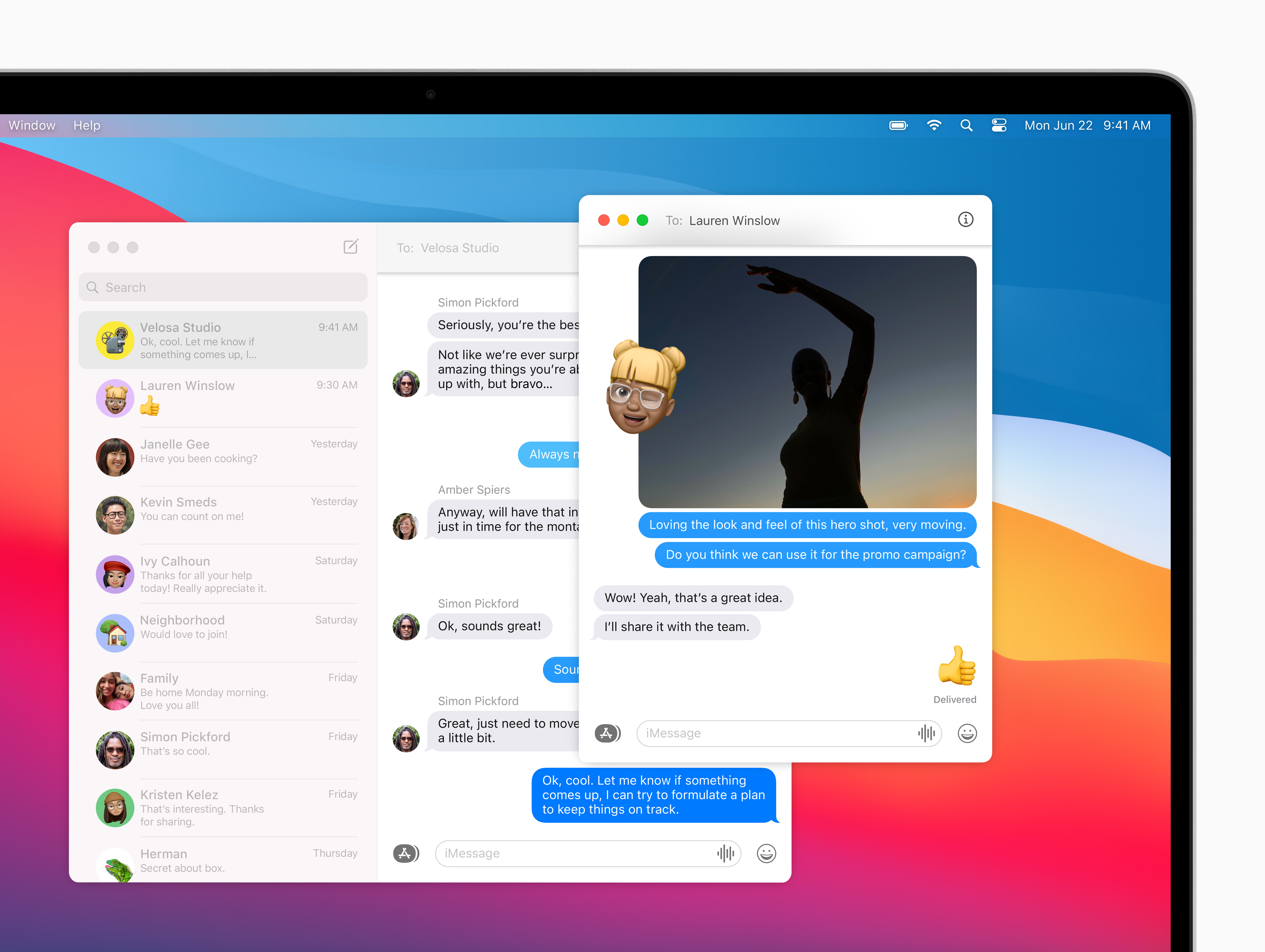 L’app Messaggi su Mac include nuovi strumenti che consentono di gestire meglio le conversazioni importanti e di inviare messaggi più espressivi. Ora è possibile fissare le conversazioni preferite in cima all’elenco dei messaggi per accedervi al volo; inoltre la funzione di ricerca è stata completamente ridisegnata, con risultati organizzati per link, foto e termini corrispondenti che permettono agli utenti di trovare rapidamente quello che cercano.