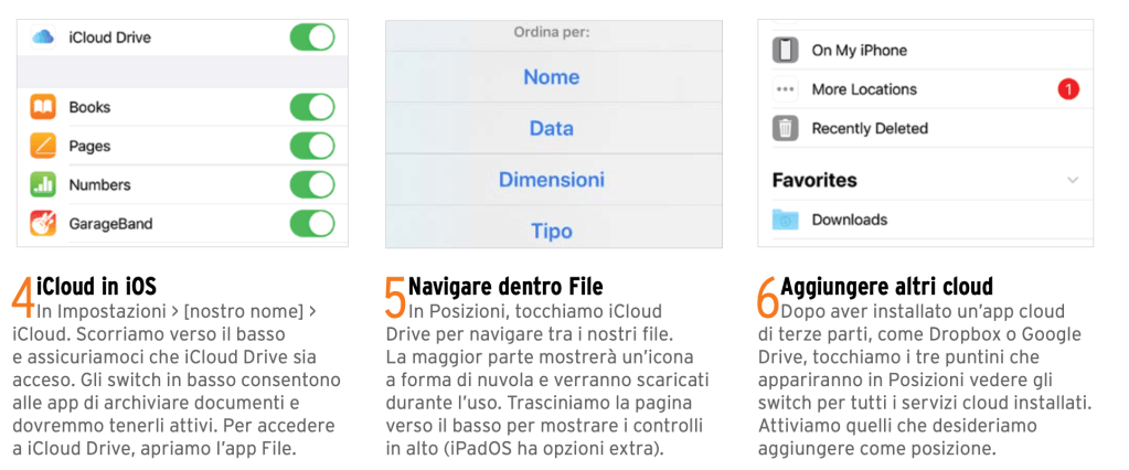 iCloud Drive è uno spazio da usare per archiviare con semplicità i documenti. Tutte le modifiche, le aggiunte e le cancellazioni vengono caricate dal dispositivo in uso sul cloud e sincronizzate su tutti gli altri dispositivi. Su Mac, iCloud Drive appare nel Finder. In iOS, è accessibile tramite l’app File (vediamo la procedura dettagliata nella pagina a fianco),