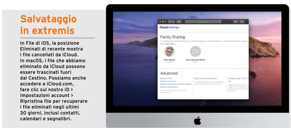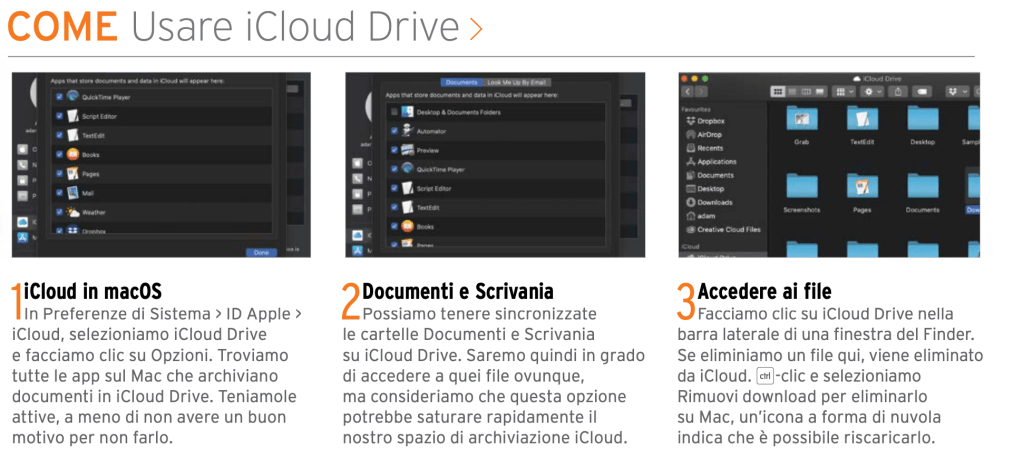 Possiamo condividere l’accesso a un file in iCloud Drive con altri utenti. In iOS, tocchiamo a lungo l file > Condividi > Aggiungi persone e scegliamo come condividere il link. Diversamente dall’invio tramite email di una copia del file, ciò consente loro di accedervi in tempo reale nel suo stato attuale. Possono anche apportare modifiche, a meno che non tocchiamo Opzioni di condivisione e scegliamo Solo visualizzazione. In macOS, entriamo in iCloud Drive nel Finder, facciamo control-clic sul file > Condividi > Aggiungi persone. Grazie agli ultimi aggiornamenti di macOS e iOS, ora è consentito anche condividere intere cartelle. Nel Finder, l’eliminazione di un file in iCloud Drive lo cancella da iCloud e dal nostro Mac, quindi scomparirà ovunque. Se vogliamo eliminarlo dal Mac ma lasciarlo in iCloud, facciamo å-clic su di esso e scegliamo Rimuovi il download. Viene cancellato immediatamente, senza andare nel Cestino, ma accanto appare un’icona a forma di nuvola. Basterà aprire il file per riscaricarlo nuovamente nel drive del Mac. Se vogliamo conservare un file sul nostro Mac in modo permanente, spostiamolo da iCloud Drive in un’altra cartella.