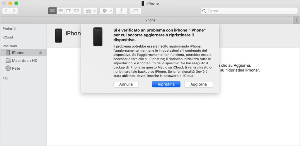 Individua l’iPhone sul computer. Quando visualizzi le opzioni per il ripristino o l’aggiornamento, scegli Ripristina. Il Finder o iTunes scaricherà il software per l’iPhone. Se il download impiega più di 15 minuti, l’iPhone uscirà dalla schermata della modalità di recupero e dovrai ripetere la procedura per rimuovere il codice indicata qui sopra per il tuo modello di iPhone.