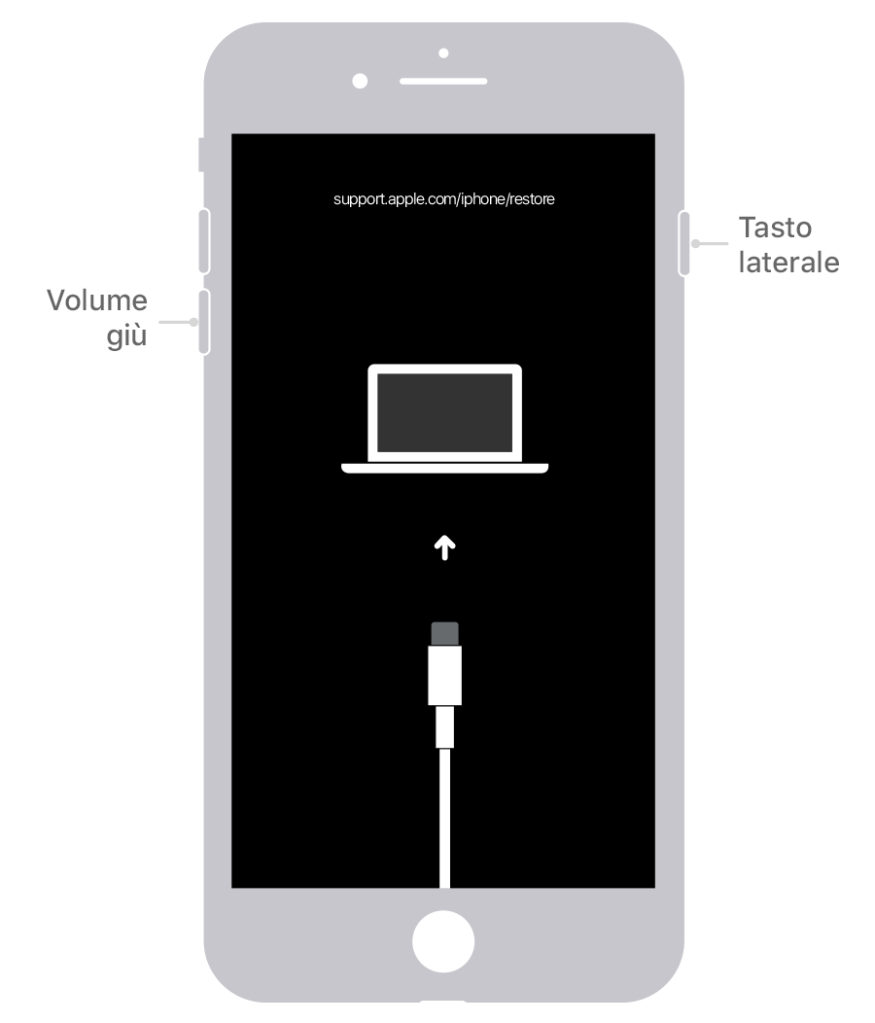 - Tieni premuto il tasto laterale finché non viene visualizzato il cursore di spegnimento. Trascina il cursore per spegnere l’iPhone. Collega l’iPhone al computer mentre tieni premuto il tasto Volume giù. Continua a tenere premuto il tasto Volume giù finché non visualizzi la schermata della modalità di recupero.