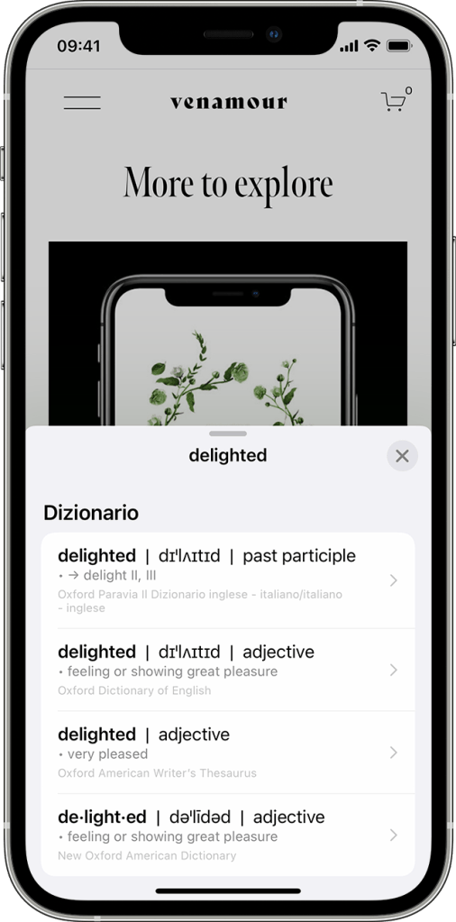 Dopo aver toccato Cerca, se hai selezionato solo una parola, viene visualizzato un dizionario. Se hai selezionato più parole, vengono visualizzati i siti web suggeriti da Siri o altre risorse in tema.