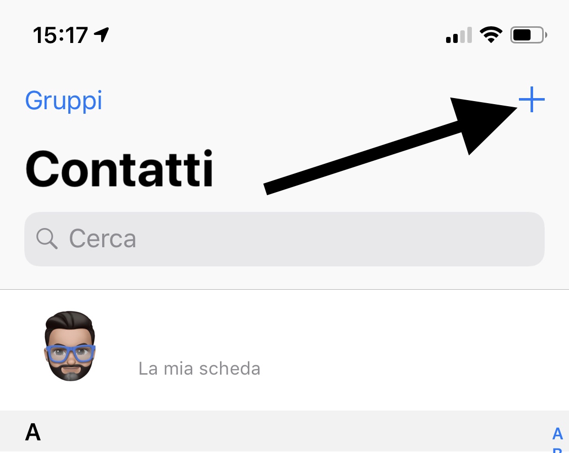 Per prima cosa apriamo l’app CONTATTI e inseriamo un nuovo numero cliccando sul + in alto a destra.