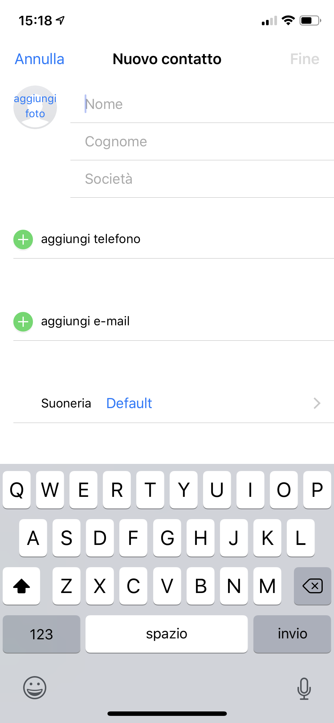Aggiungi foto, sulla sinistra, ci consente di inserire un’immagine al contatto che stiamo inserendo, non è fondamentale, ma è utile nel momento in cui magari abbiamo un contatto con un nome simile (ad esempio Maria Rossi) e non confonderlo con altri. La foto apparirà anche nell’app Messaggi e durante le chiamate.