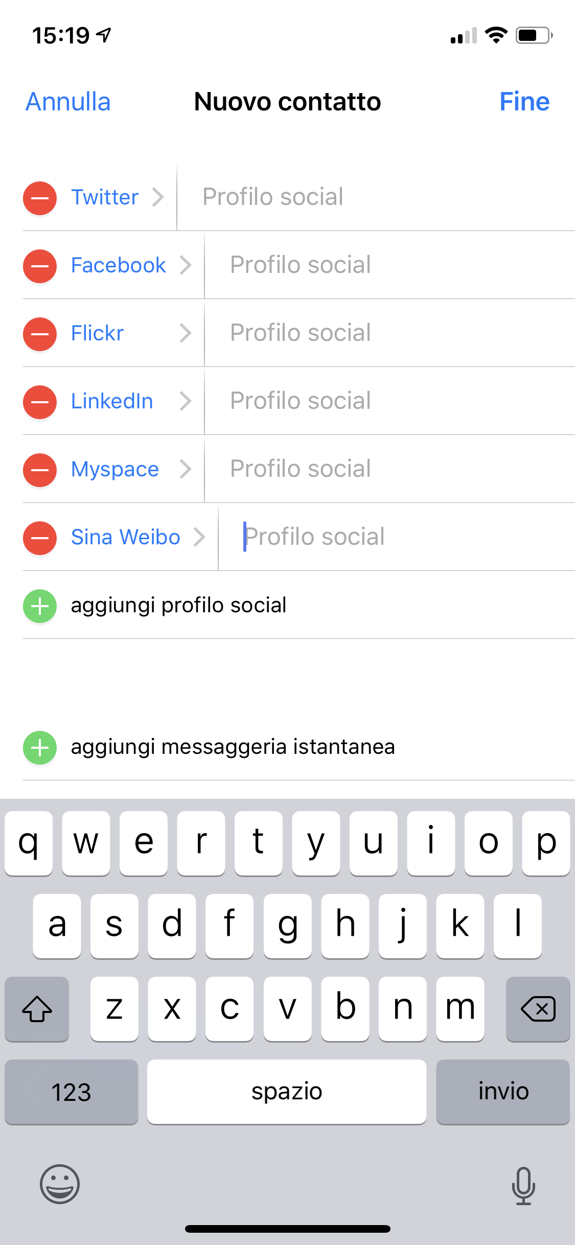 Nella sezione Aggiungi Profilo Social possiamo collegare a quel contatto il relativo profilo Facebook, Twitter, Instagram, che ci tornerà utile per un contatto diretto non solo tramite telefono.