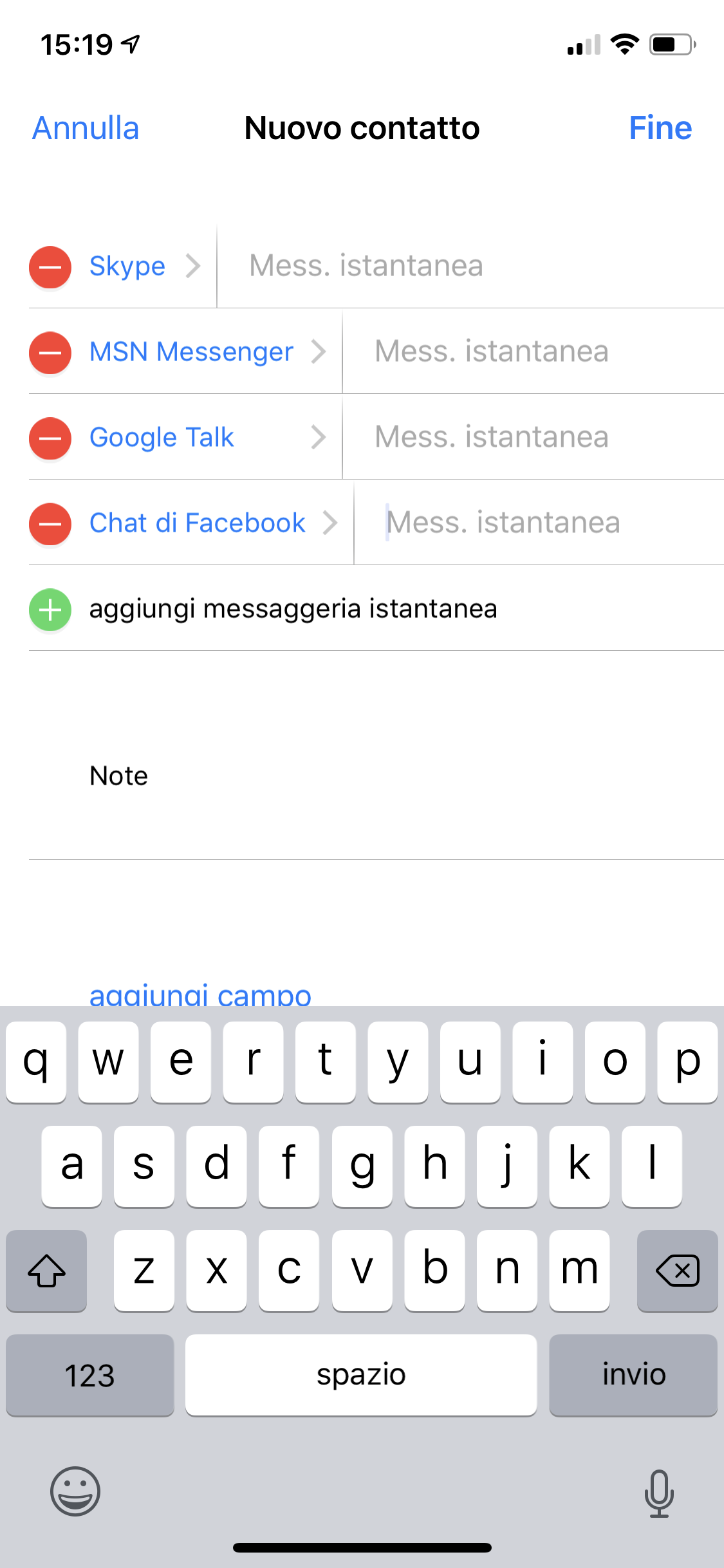 Stesso discorso per Aggiungi Messaggeria Istantanea, dove, ad esempio, possiamo inserire il profilo Skype del nostro contatto.